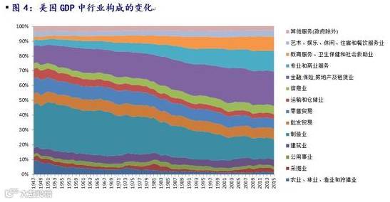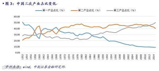 由于人类的需求具有共性,配第-克拉克定理同样适用于我国的经济发展,从产业结构变化来看,我国的发展阶段明显滞后于发达国家,2015年第三产业的占比仅为50.7%。我们正在走发达国家已经走过的道路,因此可以借鉴和参考发达国家产业发展的历程,作为判断我国未来产业更替的依据。