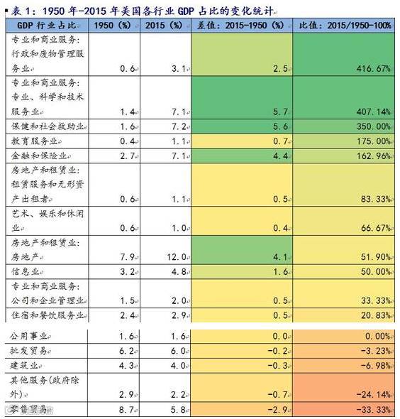 表1中对行业的划分更加细致,给出了1950年和2015年的各行业在GDP中占比的数据,并将二者进行了比较,分别计算了差值变化和比值变化。