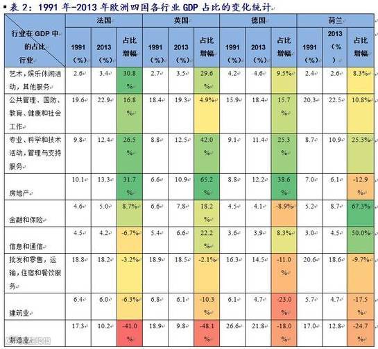 表2中给出了法国、英国、德国与荷兰的各行业在GDP中占比的数据,由于各国数据起始点不统一,我们取数据时间段的交集以便于比较,这里将1991年和2013年的数据进行对比,并计算了行业占比的比值变化,从中可以看出各国近20余年的行业增长状况。