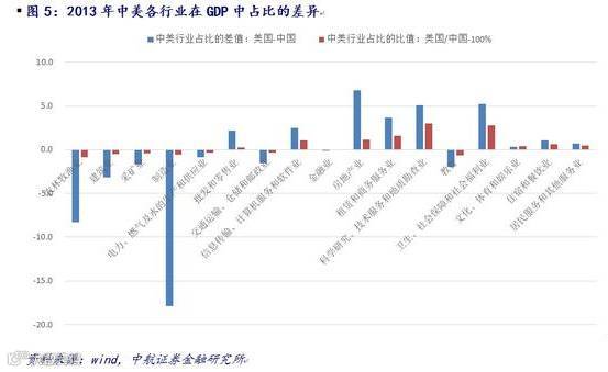 将两国行业进行对应后,我们选取2013年的数据,依照中国的行业分类对美国的行业数据进行归类,并分别计算了美国行业的GDP占比与中国行业GDP占比的差值和比值,结果见下图。综合两项数据来看,我国第三产业中行业的GDP占比普遍低于美国,其中差异较大的有:科学研究、技术服务和地质勘查业,租赁和商务服务业,卫生、社会保障和社会福利业,信息传输、计算机服务和软件业,房地产业等。