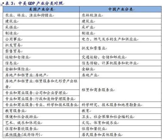 由于美国在GDP统计中的行业分类与我国存在不同,首先我们将两国GDP的行业分类进行一一对应以便于比较,对应结果见下表。需要说明的是,由于两国GDP统计方法和口径的差异,中美行业之间无法做到严格的对应,其结果只是近似可比,但对于我们的分析目的来说,其精度应能满足需要。