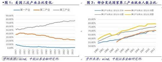 自英国工业革命后,西方发达国家经历了一个多世纪的工业化历程。从20世纪中叶开始,西方发达国家的经济结构开始从以第二产业为主逐步转向以第三产业为主,并且这一过程持续至今。下图显示了美国三次产业GDP在私营产业GDP中占比的变化过程,可以看出从50年代开始美国的第三产业占比在持续上升,第一和第二产业占比持续下降,直到2000年以后,这一变化过程放缓,经济结构维持较稳定的状态。日本和欧洲国家的数据也反映了同样的变化过程,世界银行统计的三次产业就业人数占比指标同样能够直观反映三次产业间的此消彼长,数据显示,1980年以来,日本、德国、法国和英国的三次产业就业人数占比在不断提升,至2014年上述四国中已有70%-80%的就业人员集中在第三产业中。