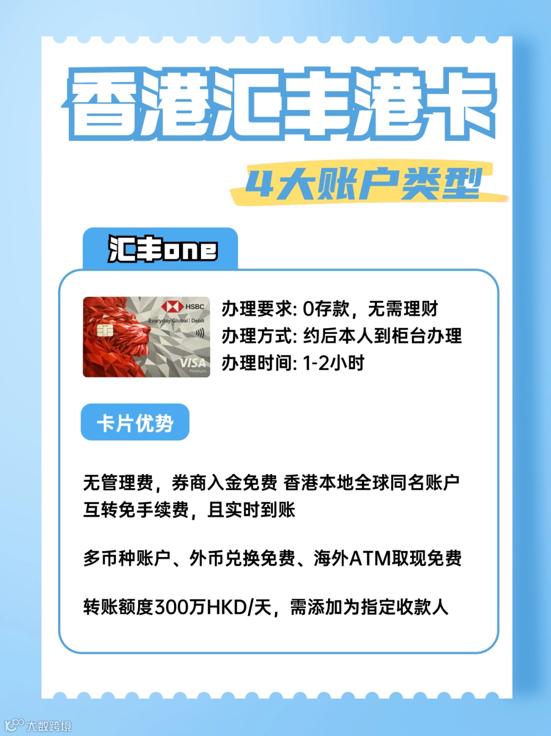 汇丰One是汇丰银行入门级的综合理财账户,集成了港元储蓄及往来账户、12种货币储蓄账户(包括人民币)、定期存款及投资户口。