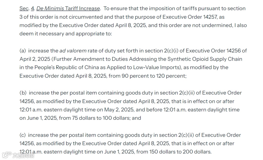 对来自中国大陆及香港、货值不超过800美元的包裹,将征收其货值的120%或每件100美元的关税(此前为90%或75美元);