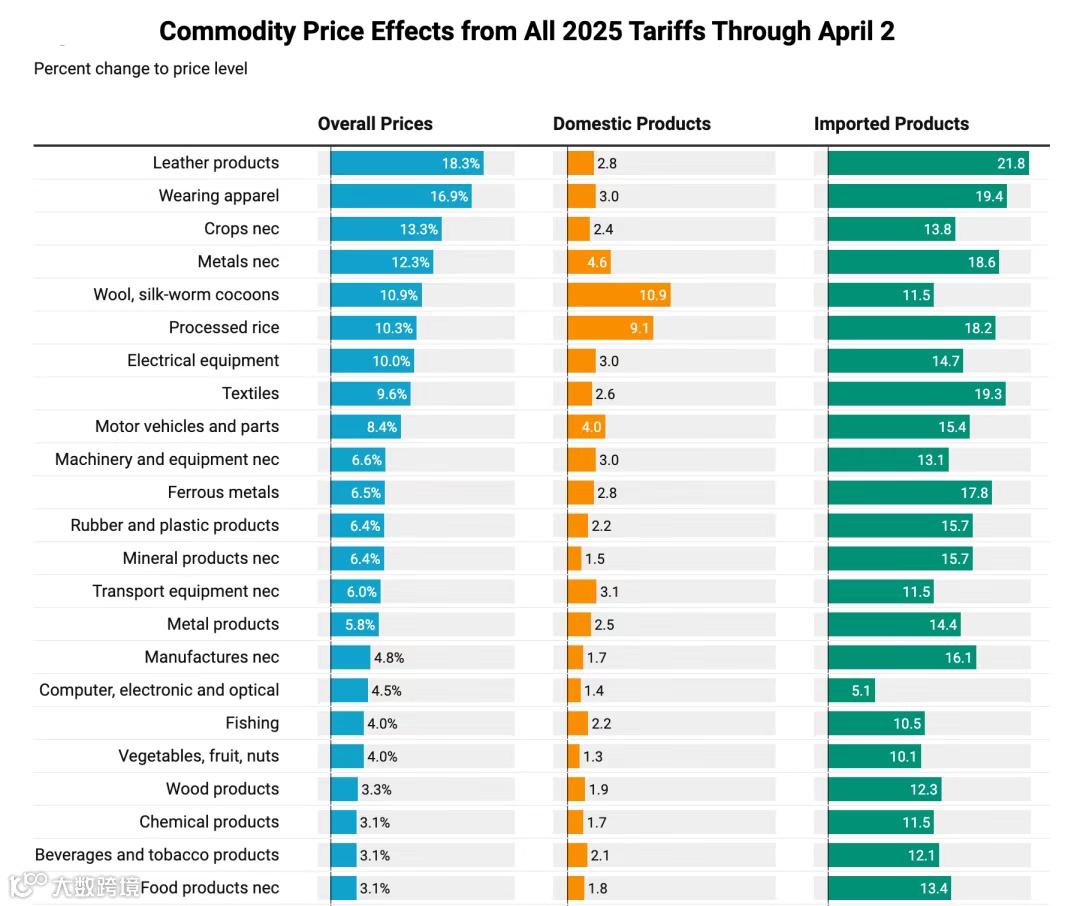 据耶鲁大学预算实验室预测,关税政策生效后,皮革制品、衣服、农作物、金属、羊毛等类别产品价格涨幅将超过10%。在此背景下,商品成本全线上浮、价格预期迅速抬升,正构成新一轮物价上行的推手,让本已吃紧的美国消费市场更加雪上加霜。