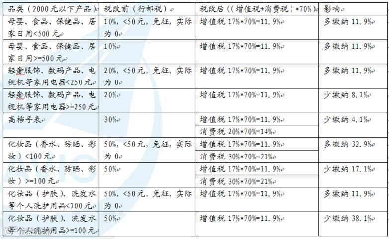 新税制实行之后,对2000元以下且原来行邮税超过50元的商品,如电视机、洗衣机等中型电器、高档手表、250元以上服装、高单价化妆品来说是利好;对原来行邮税低于50元的食品、保健品、母婴产品、居家日用品及100元以下化妆品影响较大;对其它原有大贸优势商品影响不大。