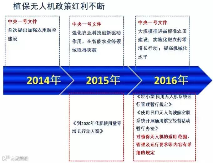 我国的农业航空业务始于1951年,一直都主要以有人驾驶固定冀飞机直升机为主,农用植保无人机仍处于初步发展阶段,但自2014年以来,中共中央国务院、民航局、农业部等多部门连续出台多项文件和规定,从宏观和微观层面为植保无人机发展带来政策红利。