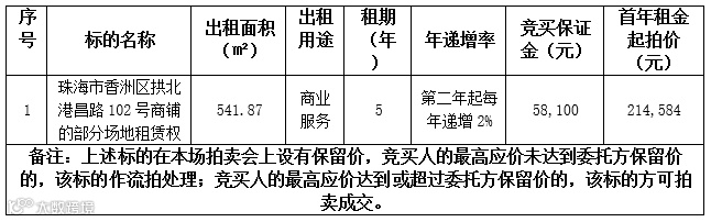 4、租金递增说明:拍卖成交的,标的第一年租金按拍卖成交月租金价进行计算,标的租金递增幅度按《租赁权拍卖标的目录》载列执行。