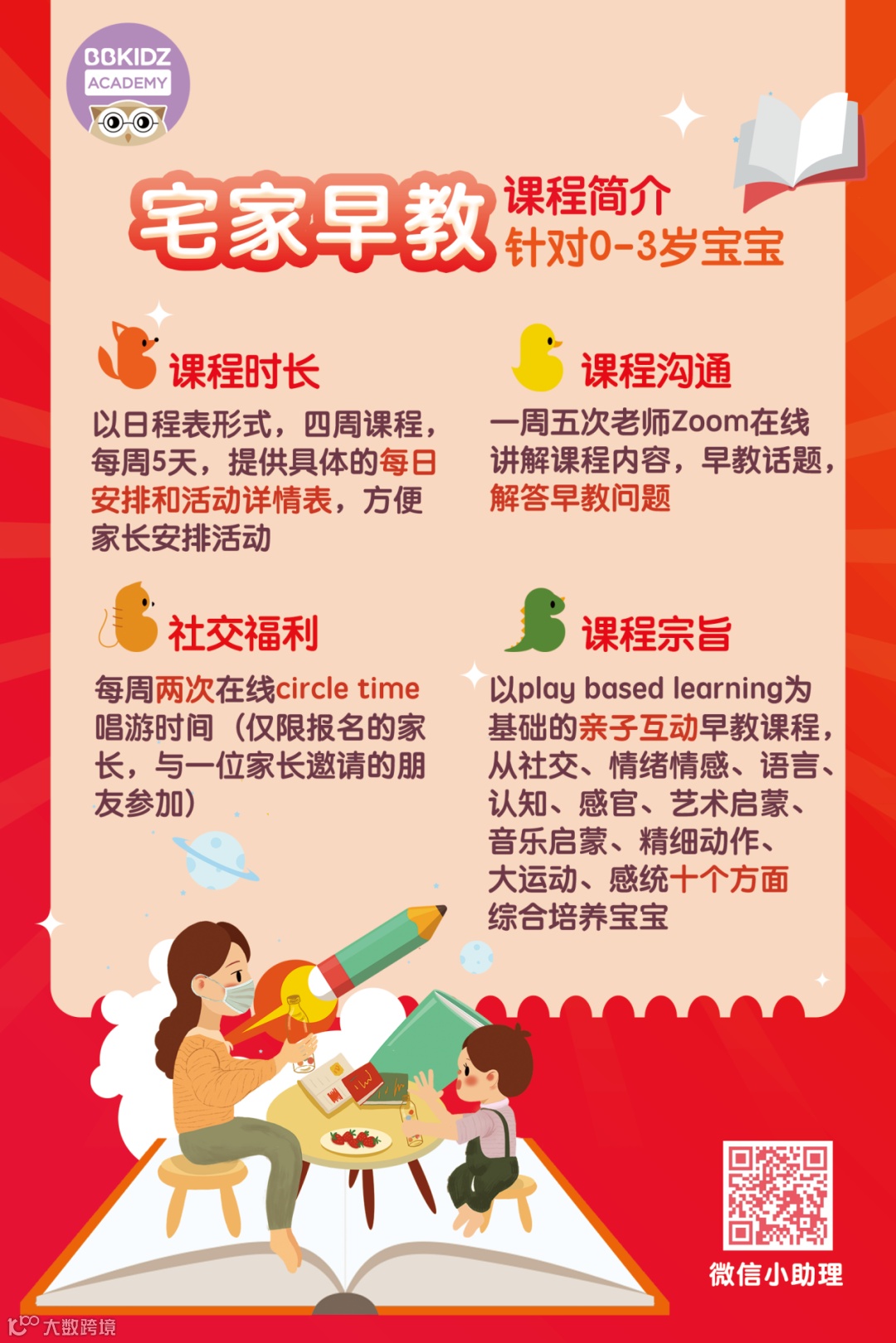 BBKidz Academy宅家早教主打加拿大Elect玩中学早教理念。结合蒙特梭利、瑞吉欧和华德福理念的精髓来综合培养0-3岁宝宝的社交、情绪情感、语言、认知、感官、艺术启蒙、精细动作、大运动、感统十个方面。我们有安省专业ECE老师每周制定活动内容、绘本及儿歌教学、学员专属circle time、讨论早教话题和解答家长问题。适合重视早教,但不知道每天如何陪玩的家庭。也适合想让宝宝提前适应上学规律生活的家长。