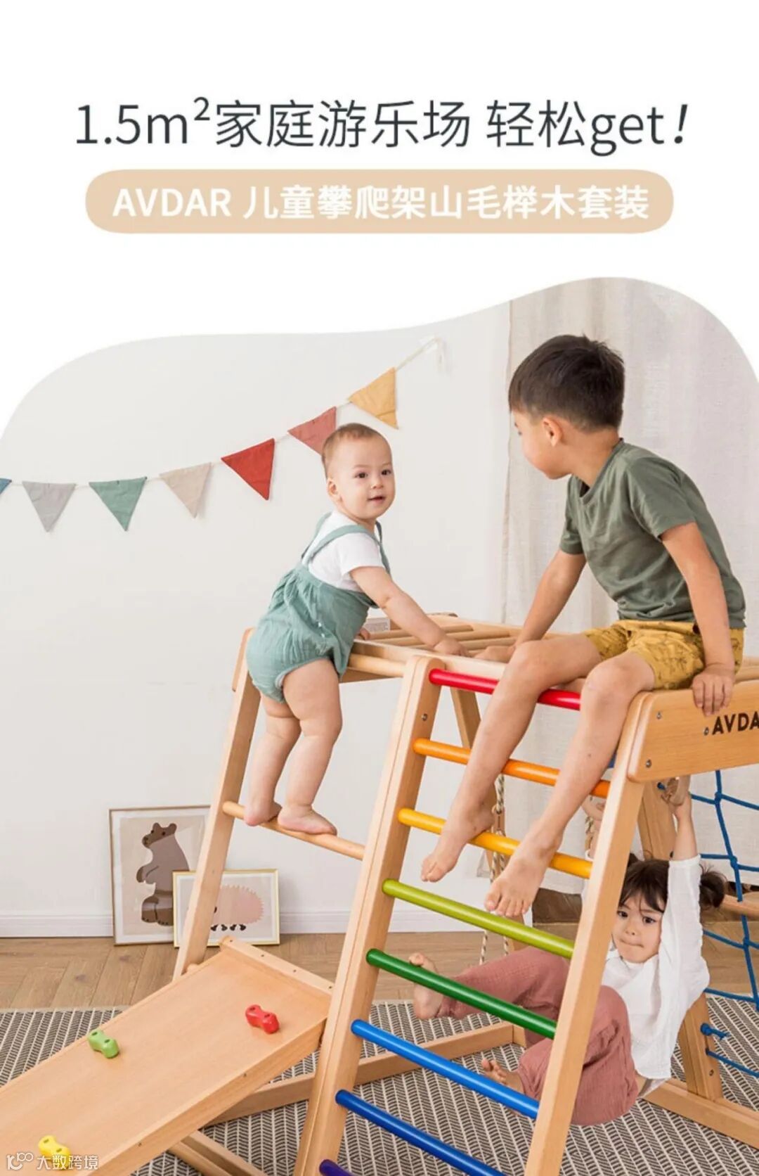 攀爬架丰富了滑梯、吊环、秋千、帐篷、吊床、画板等配件。独创的可延展设计,客厅的一角也能成为0-7岁孩子的百变“儿童房”