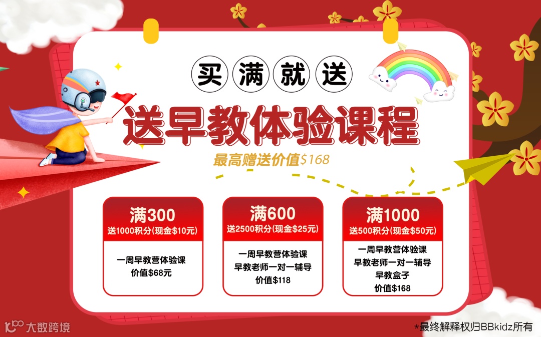 ·满1000送5000积分(价值现金$50元) 一周早教营体验课+早教老师一对一辅导+早教盒子价值$168)
