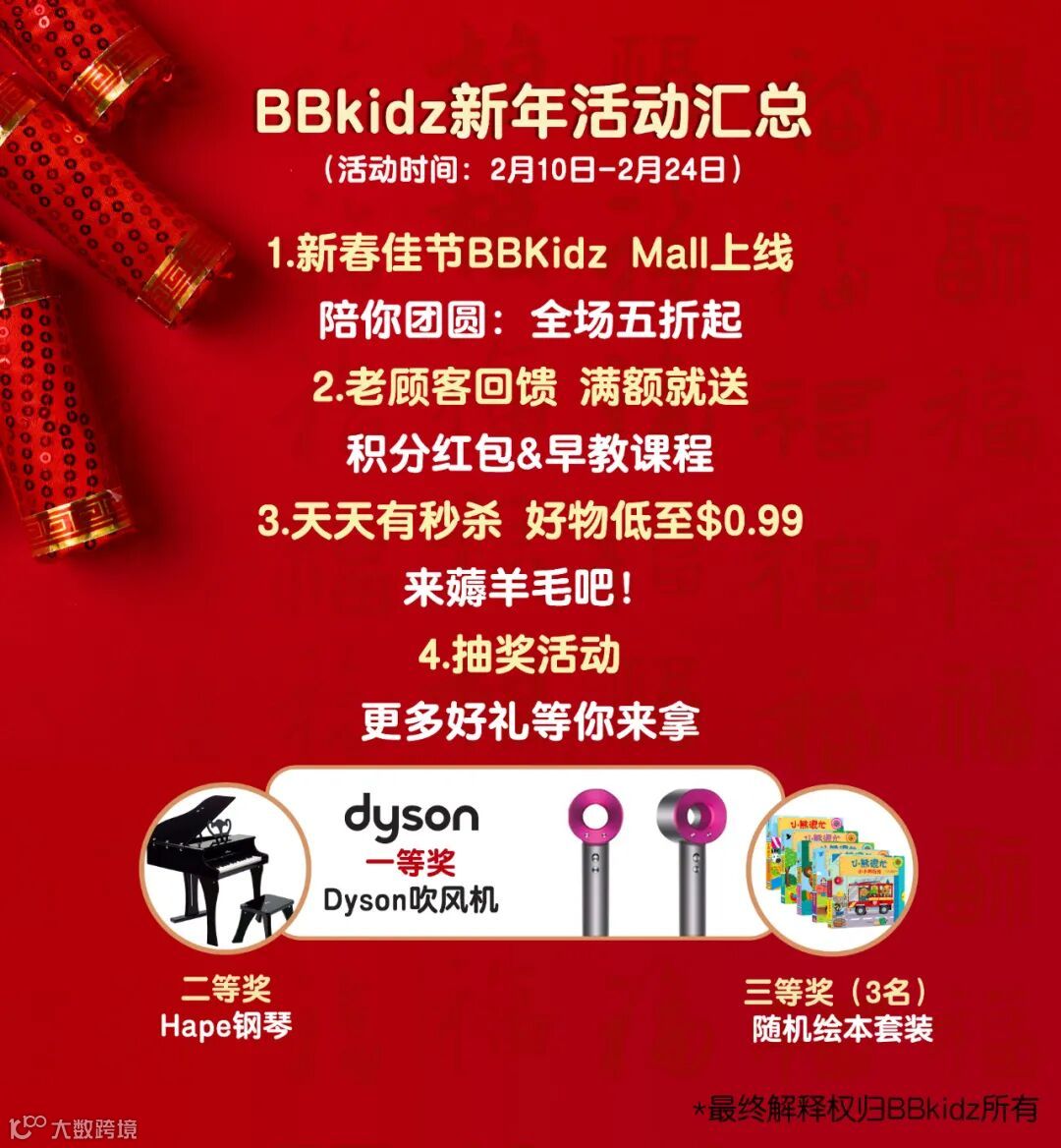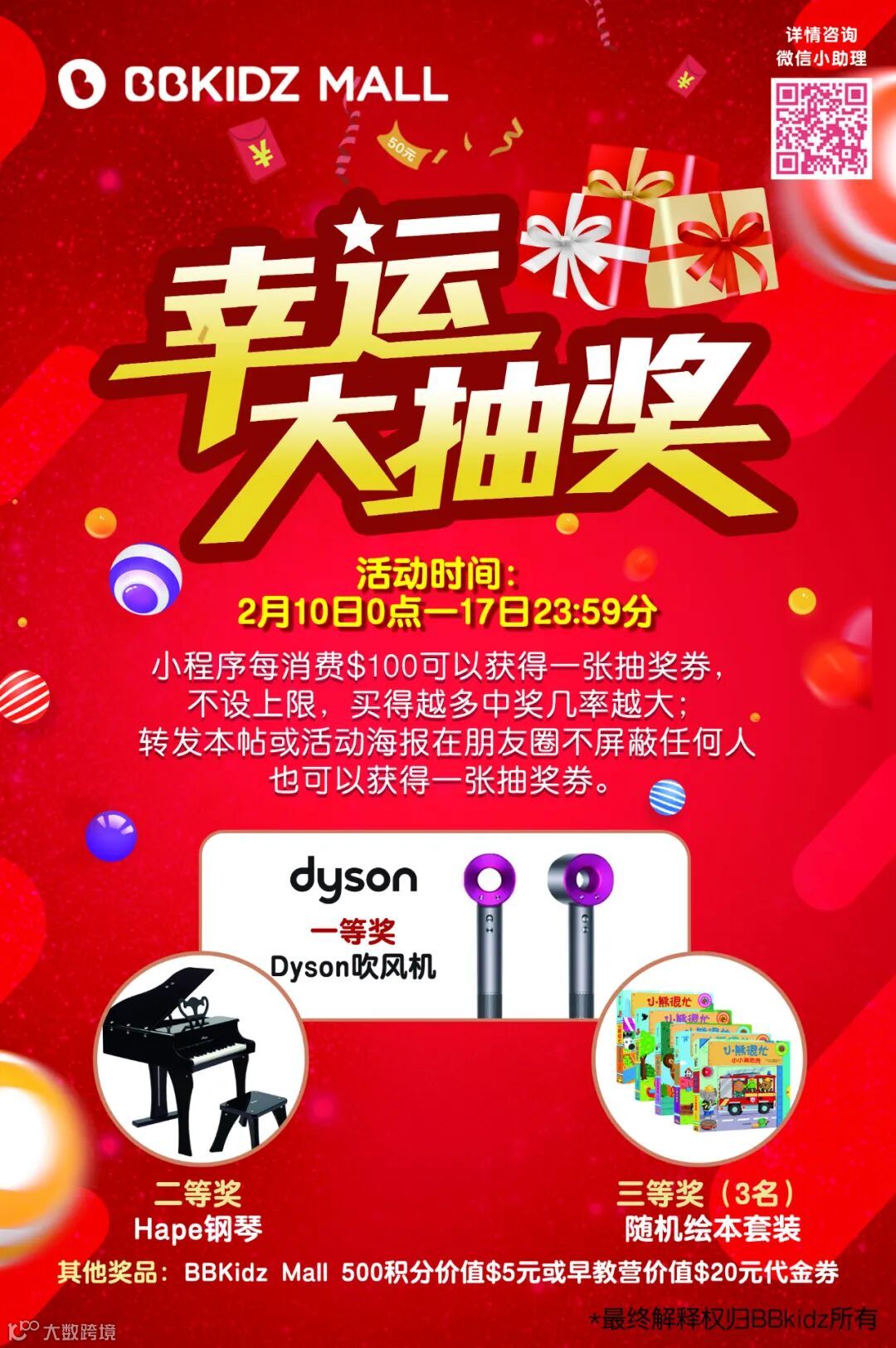 ①凡在活动期间BBKidz Mall每消费$100可以获得一张抽奖券,不设上限,买得越多中奖几率越大;