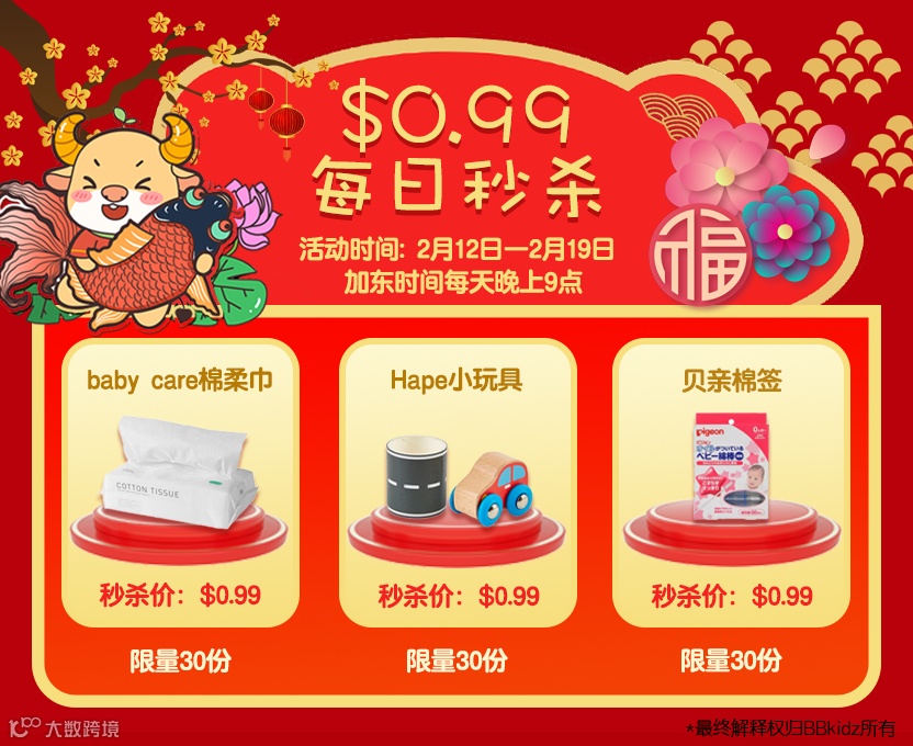 活动规则:活动期间,BBKidz Mall限时抢购商品,一个ID限购一份,数量有限,先到先得