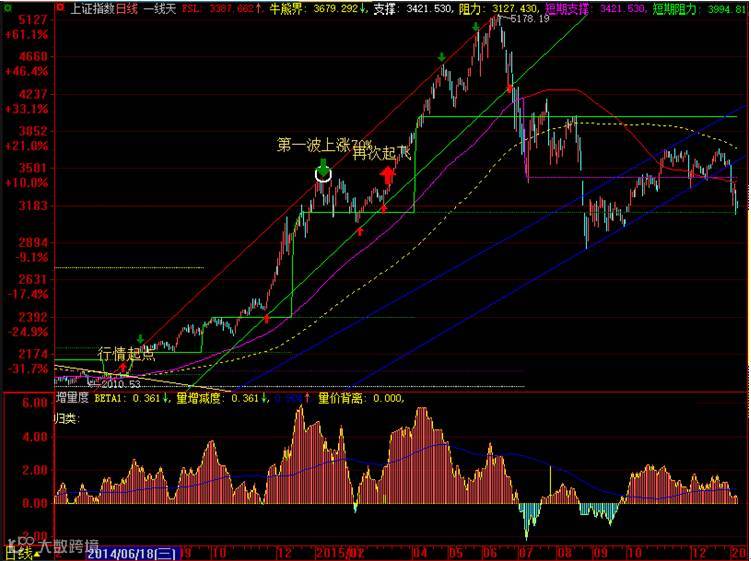 如果画出两条平行线,让我们所关注的一段行情走势都被包夹在两条平行线之间的话,我们可以形象地称两条平行线为通道线,如果通道向上攀升,我们称之为上升通道,向下延伸我们称之为下降通道。图中所示的蓝色通道是本人6月25日画出的红绿线疯牛市的上升通道之后新加上的反弹上升通道。