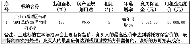 4、租金递增说明:拍卖成交的,标的第一年租金按拍卖成交月租金价进行计算,标的租金递增幅度按《租赁权拍卖标的目录》载列执行。