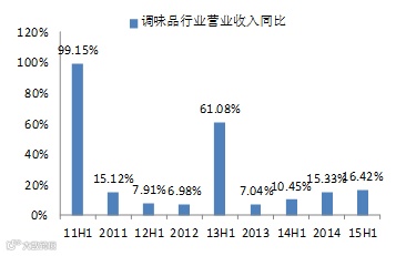 从产业生命周期看,调味品行业处于成长期,2013年至今行业增速持续提升。在食品饮料子行业中,属于增速较快行业,2015年上半年在整体消费需求疲软,行业增速普遍下降的背景下,我们统计的8家调味品公司营业收入实现了16.42%的高速增长,高于食品饮料各子行业增速普遍个位数的增速。