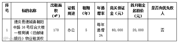 4、租金递增说明:拍卖成交的,标的第一年租金按拍卖成交月租金价进行计算,标的租金递增幅度按《租赁权拍卖标的目录》载列执行。