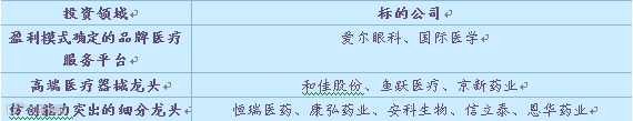 按照上述逻辑,我们建议积极介入医疗服务行业、医疗器械行业和创新药物领域,具体的标的包括爱尔眼科、和佳股份、京新药业、恒瑞医药、康弘药业和安科生物等。