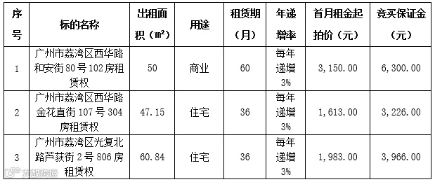 ②标的租金递增及装修免租期说明:上述标的第一年租金按拍卖成交月租金价进行折算,租金从第二年开始逐年递增3%;拍卖成交后,上述标的委托方给予租赁人30天装修免租期,在装修前,租赁权买受人应将装修方案报委托方,经委托方审核同意后方可开始装修。