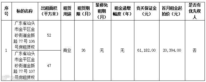 此次拍卖标的位于汕头市金平区金砂街道金新路77号106、107号,东临平北街、南面临住宅商铺、西临金新南路、北临金砂中路,附近有金砂公园、华侨新村路步行街、金平区中山幼儿园、汕头市公路事务中心、汕头国际大酒店、金平区政府等建筑,标的附近金砂公园东站有9路、16路、32路等多条公交车经过,周边交通便利,人员聚集,各项配套设施齐全。
