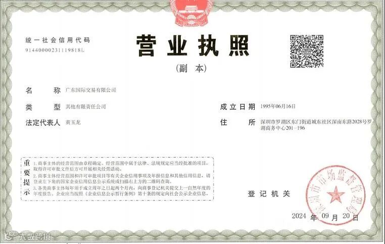 9月20日,广物控股集团所属广物金融旗下广东国际交易有限公司的营业执照在深圳市罗湖区正式换发,标志着有近三十年发展历史的广东国际拍卖有限公司(简称“广东国拍”)正式更名为广东国际交易有限公司(简称“广东国交”),迈入交易新时代!