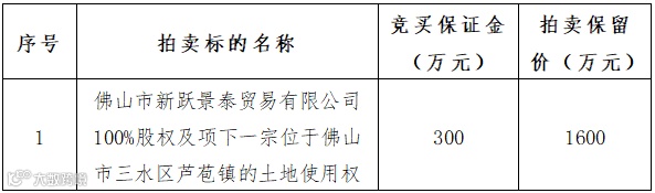 此次拍卖标的为佛山市新跃景泰贸易有限公司100%股权及项下一宗位于佛山市三水区芦苞镇的土地使用权,标的情况请查看本场拍卖会《竞买须知》等资料,其中: