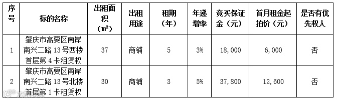 4、租金递增说明:拍卖成交的,标的第一年租金按拍卖成交月租金价进行计算,标的租金递增幅度按《租赁权拍卖标的目录》载列执行。