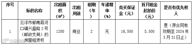 1、此次拍卖标的按现状进行拍卖,现有原租赁人在经营使用,原租赁人在同等价位享有优先竞租权;拍卖成交后,租赁权买受人需自行办理相关经营手续或相关政府部门备案,办理过程中产生的一切费用均由租赁权买受人负责承担;如因产权、规划用途等问题造成租赁权买受人不能办理开业相关证照的,其风险责任和费用由租赁权买受人自行承担,委托方和拍卖人不承担任何责任;竞买人应实地查看了解房屋的现状及相关费用,并对拍卖标的房屋的权利状况、相应资质、行政审批手续等自行调查了解。竞买人成功办理竞租报名手续,即视为其对标的现状无异议,并对存在或可能存在的瑕疵表示认可,且承诺因存在或可能存在的瑕疵造成的风险由竞买人自行承担。