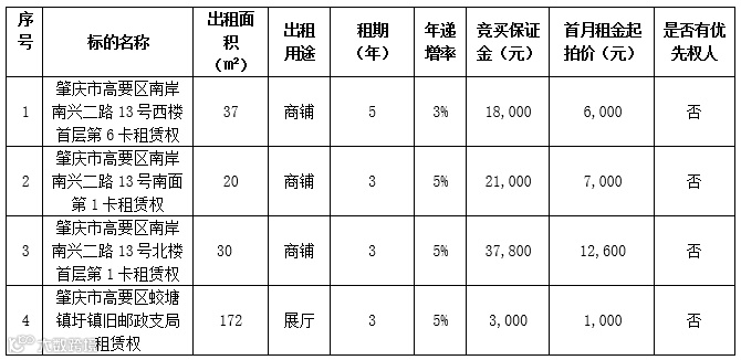 4、租金递增说明:拍卖成交的,标的第一年租金按拍卖成交月租金价进行计算,标的租金递增幅度按《租赁权拍卖标的目录》载列执行。