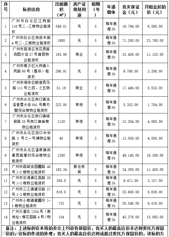 4、租金递增说明:拍卖成交的,标的第一年租金按拍卖成交月租金价进行计算,标的租金递增幅度按《租赁权拍卖标的目录》载列执行。