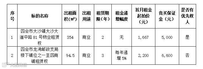 上述物业按现状出租,其中标的序号1现有原租赁人在经营使用,原租赁合同有效期至2021年12月31日止,原租赁人在同等价位享有优先竞租权,标的序号2现为空置状态;拍卖成交后,上述物业如因产权问题造成租赁权买受人不能办理开业相关证照的,其风险和费用由租赁权买受人自行承担。