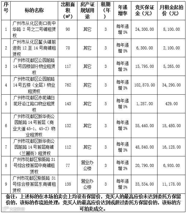 1、此次拍卖标的按现场现状进行拍卖,其中标的序号1-2有原租赁人在营业使用,原租赁人在同等价位享有优先竞租权,标的序号1原合同有效已到期,标的序号2原合同有效期至2022年9月30日止;标的序号3-9现为空置状态。标的出租用途以房产证规划用途为准,拍卖成交后,租赁权买受人需自行办理相关经营手续或相关政府部门备案,办理过程中产生的一切费用均由租赁权买受人负责承担;如因产权、规划用途等问题造成租赁权买受人不能办理开业相关证照的,其风险责任和费用由租赁权买受人自行承担,委托方和拍卖人不承担任何责任;竞买人应实地查看了解房屋的现状及相关费用,并对拍卖标的房屋的权利状况、相应资质、行政审批手续等自行调查了解。竞买人成功办理竞租报名手续,即视为其对标的现状无异议,并对存在或可能存在的瑕疵表示认可,且承诺因存在或可能存在的瑕疵造成的风险由竞买人自行承担。