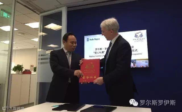 图为罗尔斯·罗伊斯东北亚区总裁何英杰(Patrick Horgan)先生与中国扶贫基金会执行副会长王行最在签字仪式上。