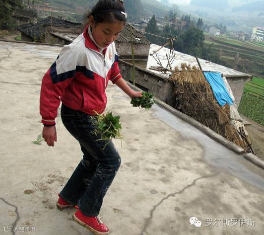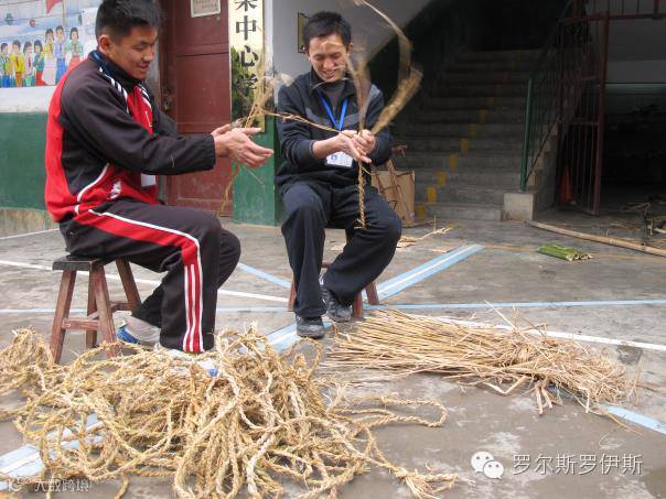 贵州一所小学的老师用手搓稻草代替塑胶跳绳和拔河绳: