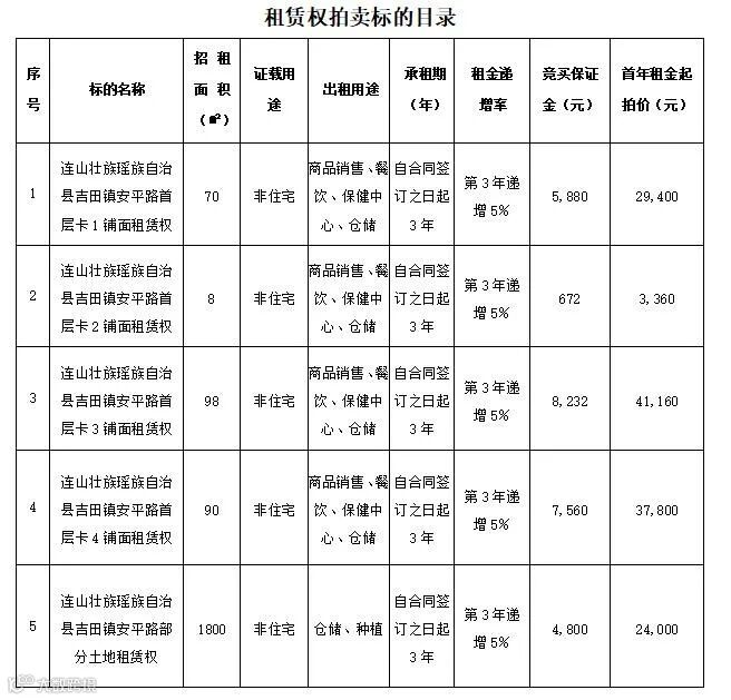 1、上述标的按现状进行拍卖,其中标的序号1、2、3有原租赁权人在经营使用,原《租赁合同》有效期至2021年12月31日止,原租赁权人在同等价位享有优先竞租权,标的序号4、5现为空置状态。