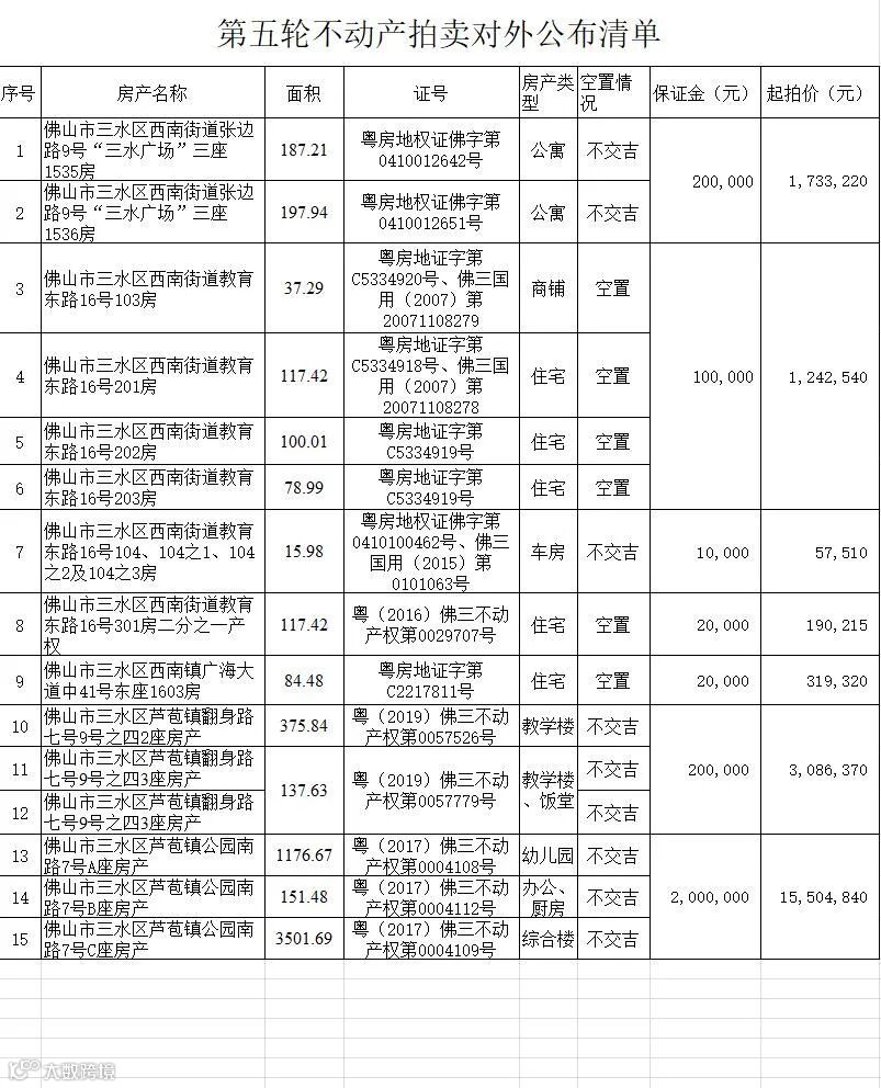受委托,兹定于2022年9月15日上午10时至9月16日上午10时(延时除外)阿里资产处置平台(网址:https://zc-paimai.taobao.com/)公开拍卖涉案财产一批:佛山市三水区西南街道三水广场、广海大道中41号、教育东路16号、芦苞镇翻身路七号和公园南路7号等地14套房产及1个车房