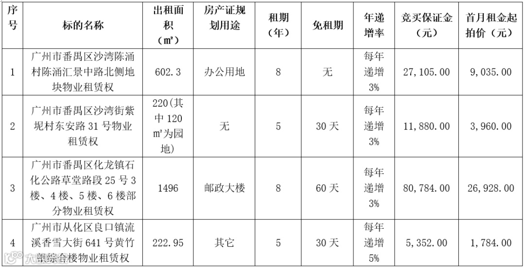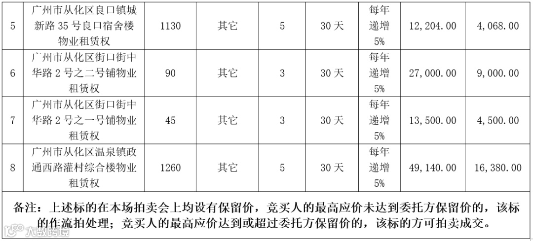 4、租金递增说明:拍卖成交的,标的第一年租金按拍卖成交月租金价进行计算,标的租金递增幅度按《租赁权拍卖标的目录》载列执行。