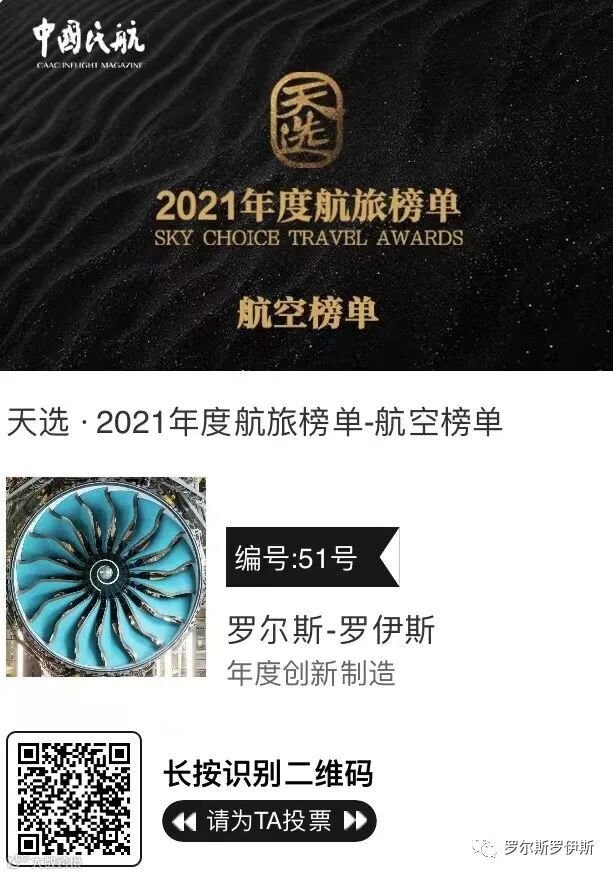 罗罗正在参加《中国民航》杂志首届“天选 • 2021年度航旅榜单”评选,为UltraFan争取“年度创新制造”称号。本周公众网络投票正在进行中,欢迎支持罗罗的各界朋友为我们投票加油。