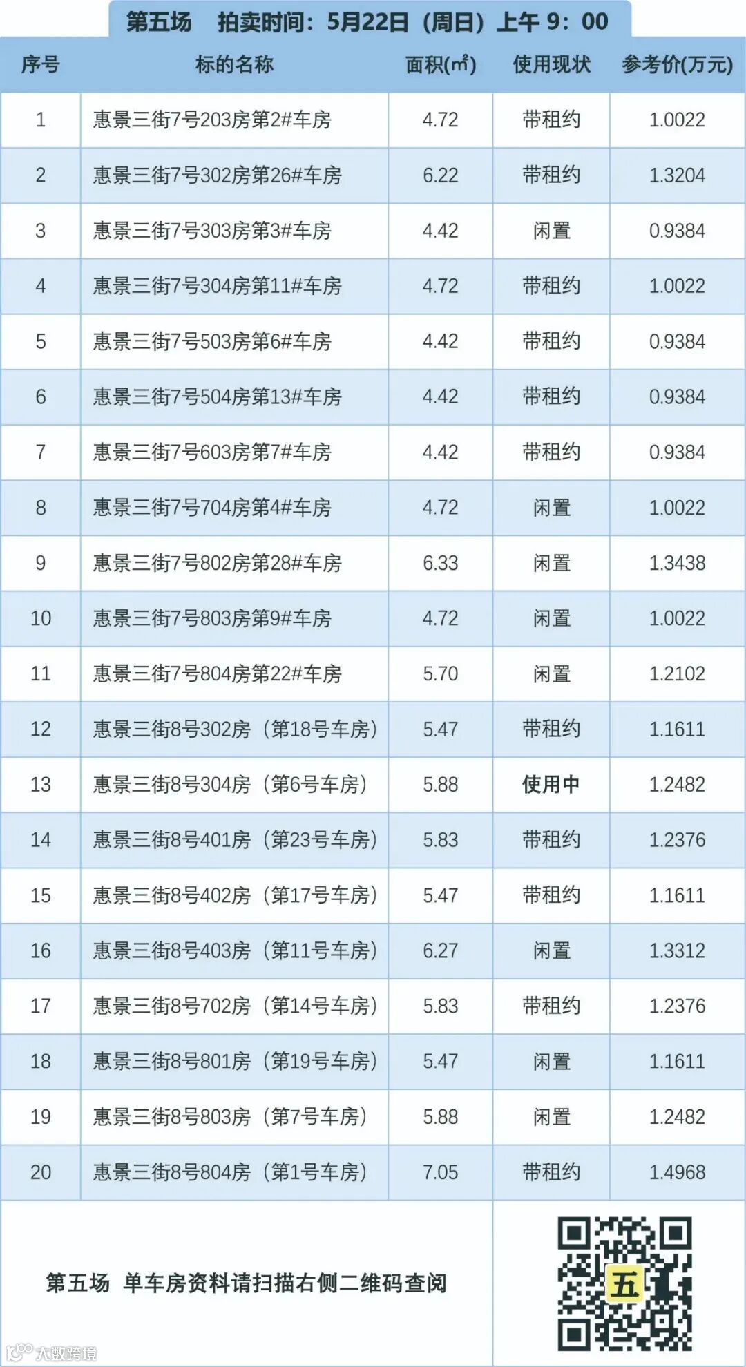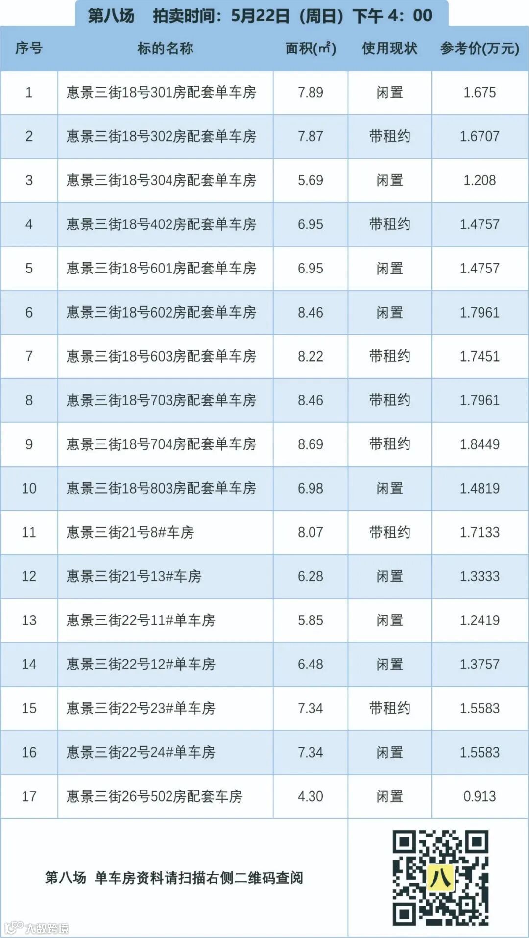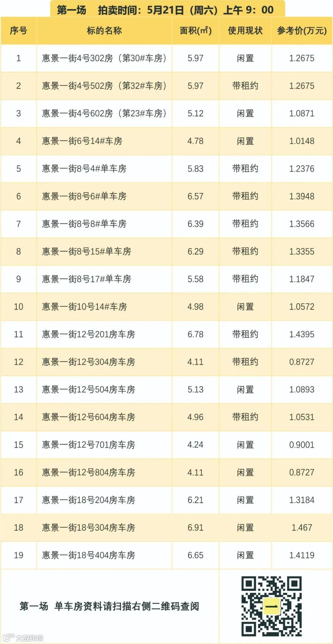 受佛山市机关事务管理局委托,广东国锤拍卖有限公司、广东国际拍卖有限公司定于2022年5月21日-22日在佛山市禅城区绿景一路惠景城小区北门水池旁平台(惠景二街19、21号原佛山市城市展览馆对面)举行8场拍卖会,对以下惠景城小区156个住宅配套单车房进行公开拍卖。
