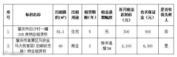 上述物业按现状出租,其中标的序号2现有原租赁人在经营使用,原租赁合同有效期至2022年3月31日止,原租赁人在同等价位享有优先竞租权,标的序号1现为空置状态;拍卖成交后,上述物业如因产权问题造成租赁权买受人不能办理开业相关证照的,其风险和费用由租赁权买受人自行承担。