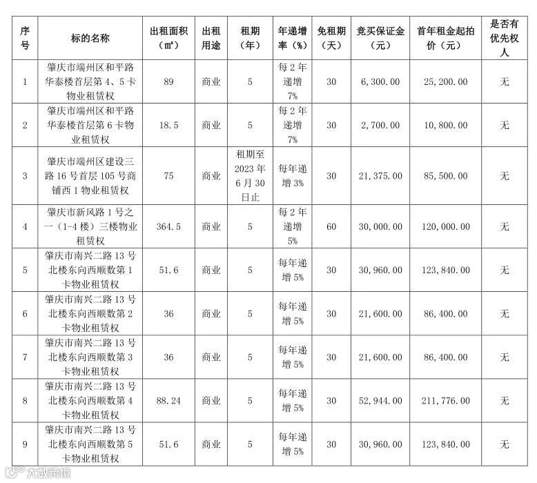 ②标的装修期免租期及递增说明:详见《租赁权拍卖标的目录》载列。租赁权买受人在不改变标的结构情况下,可对标的进行改造装修,在装修前,租赁权买受人应将装修方案报委托方,经委托方审核后方可开始装修,且必须符合相关安全指标,若造成标的损毁,由租赁权买受人自行承担。