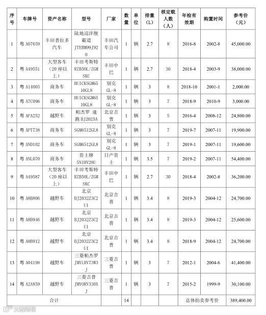 粤A07659等14辆旧机动车(整体保证金:14万元,分拆保证金:1万元/辆,整体参考价38.94万元)。
