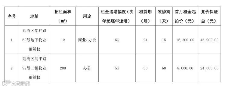 ③标的装修期免租期说明:在装修前,租赁权买受人应将装修方案报委托方,经委托方审核同意后方可开始装修;其中序号1在租赁合同期内最后15天为装修期免交租金,序号2在租赁合同期内最后60天为装修期免交租金。