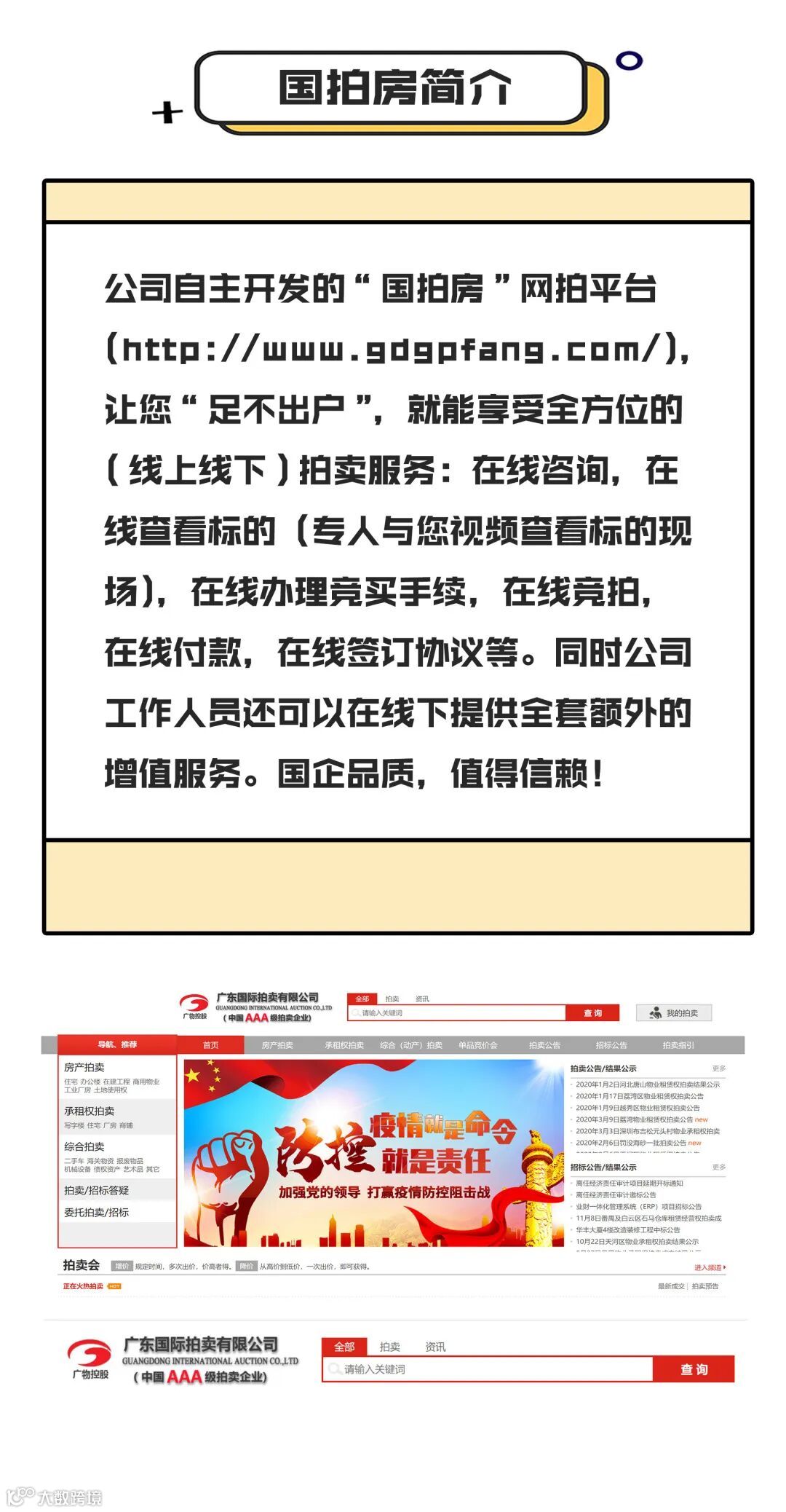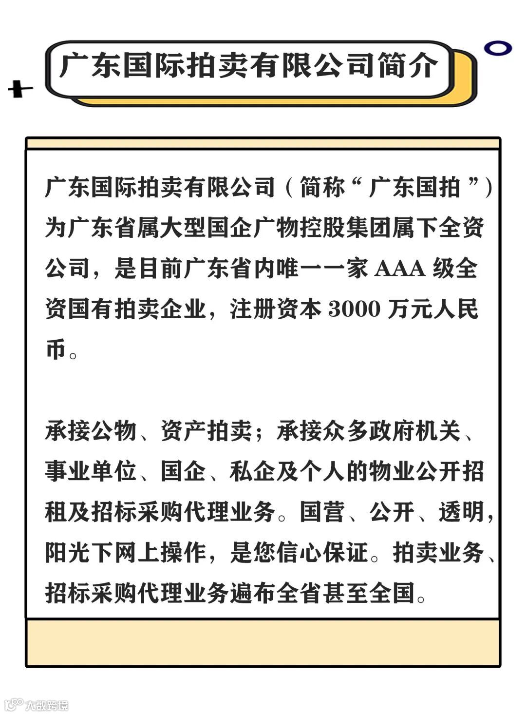 广东国际拍卖有限公司是国内贸易部和广东省人民政府联合发文批准的综合性拍卖机构,注册资金为人民币3000万元。经营范围包括:动产、不动产和无形资产的拍卖;招标采购代理服务;投资咨询服务;房地产中介服务。