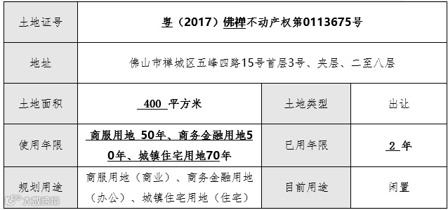 位于佛山市禅城区五峰四路15号首层3号、夹层、二至八层,建筑面积4051.31㎡,土地使用用途:商服用地(商业)、商务金融用地(办公)、城镇住宅用地(住宅)。目前标的天面租赁给中国移动作设备通讯基站使用,标的其他处于空置状态。