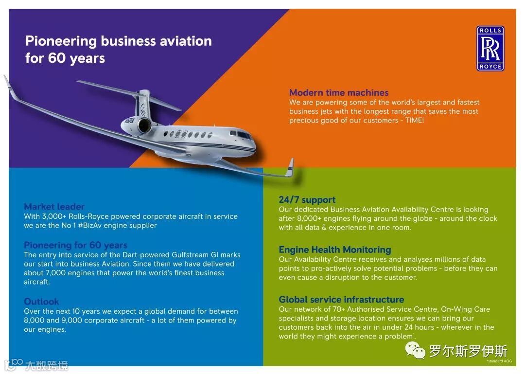 罗罗是公务航空领域的真正开拓者,通过不断突破技术极限奠定了其头号发动机制造商的市场地位。最近推出的珍珠系列发动机和智能发动机愿景将为我们再次引领新时代提供保障。我们的客户不仅仅是购买了一架飞机——他们购买的是一台时间机器。飞机是帮助他们节约最宝贵商品——时间的强有力工具。我们正是凭借可靠、清洁和一流产品来帮助客户实现这一目标。 ”