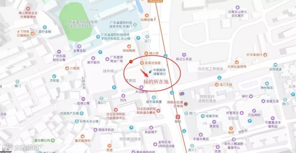 该标的位于广州市白云区广州大道北2087号,雄洲商业广场、广东省国防技师学院旁。周边有邮政储蓄银行、同和街道办事处、同和街行政服务中心、雄洲农贸市场、翠景园居民小区等,周边生活设施及市政配套设施完善,交通网络便利。