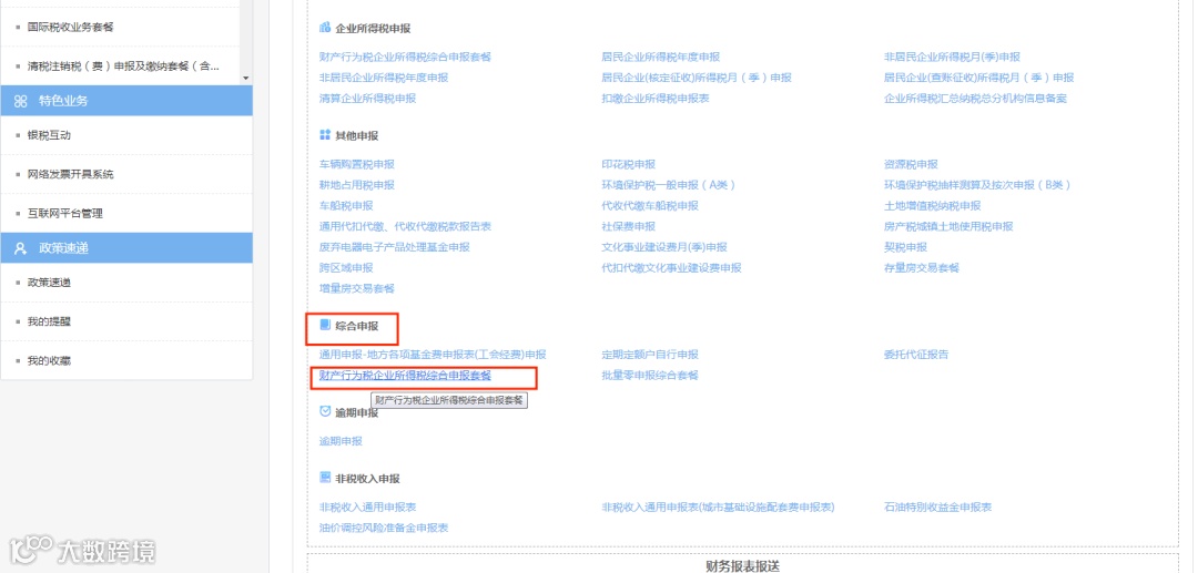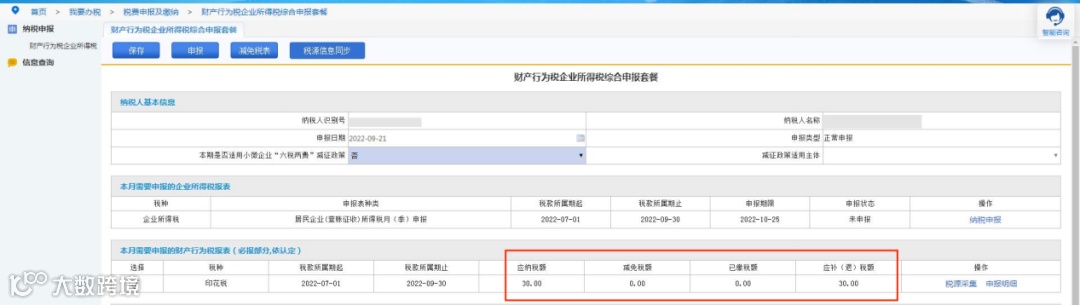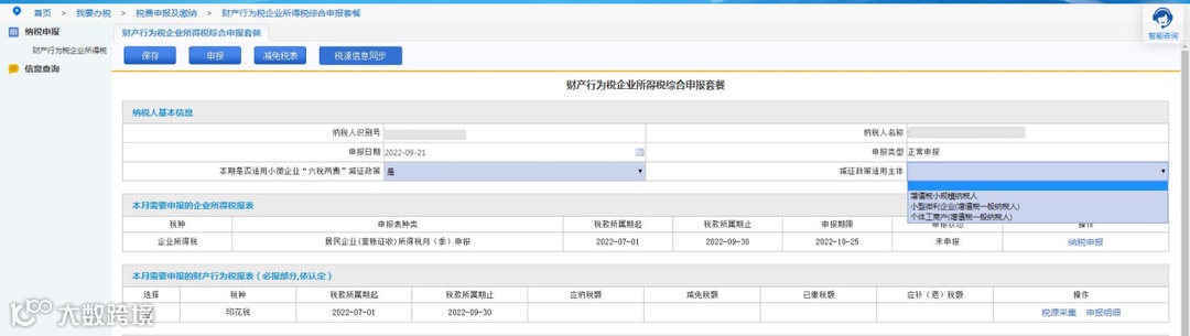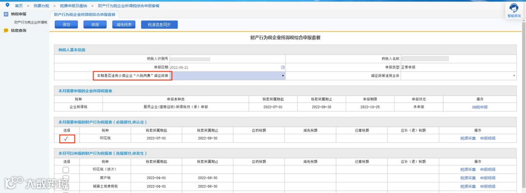 点击“综合纳税申报”按钮,页面跳转至“财产行为税企业所得税综合申报套餐”页面,勾选需要申报的印花税信息,若系统无法自动判断纳税人是否享受“六税两费”优惠政策,则需要纳税人根据实际情况自行选择。