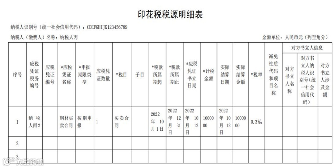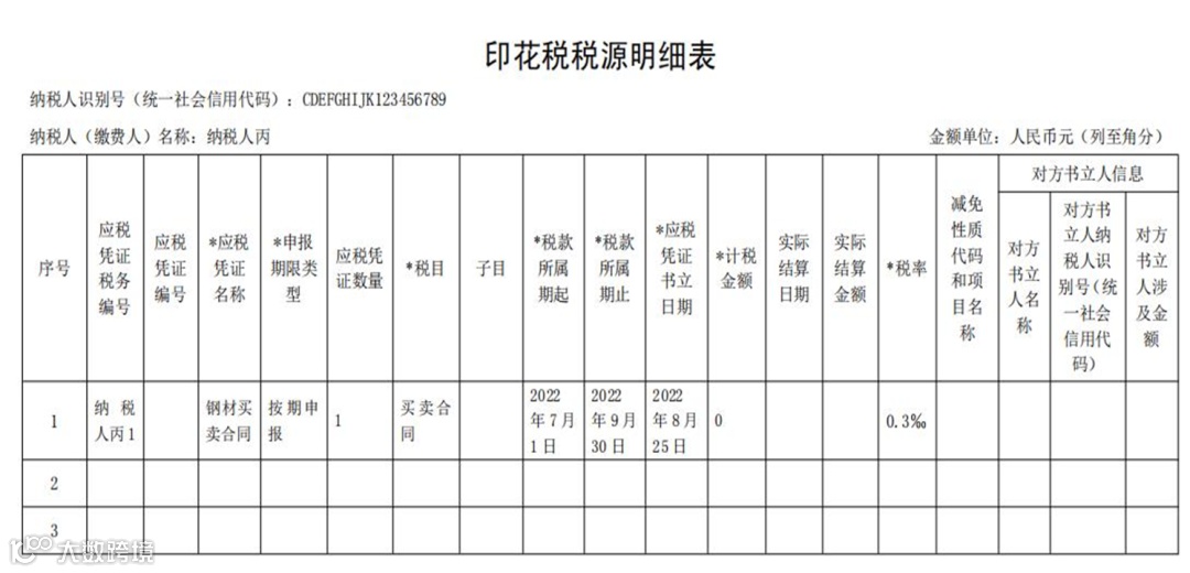 ❖纳税人丙2022年10月纳税申报期应缴纳印花税:0元×0.3‰=0元
