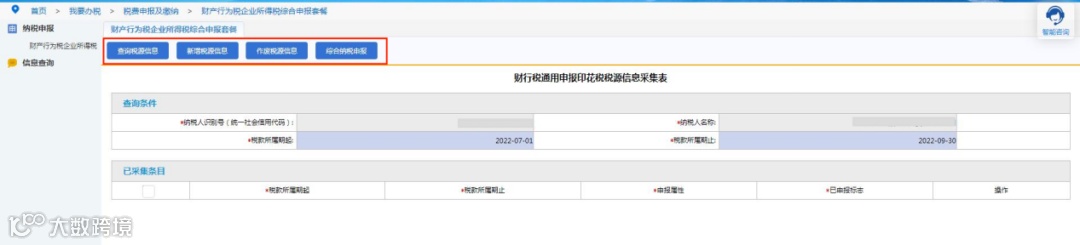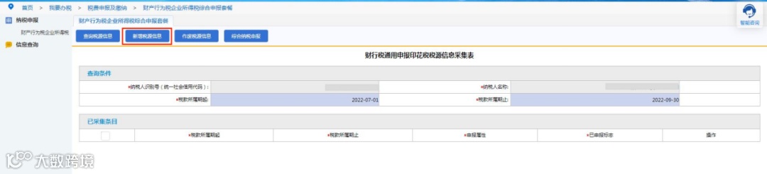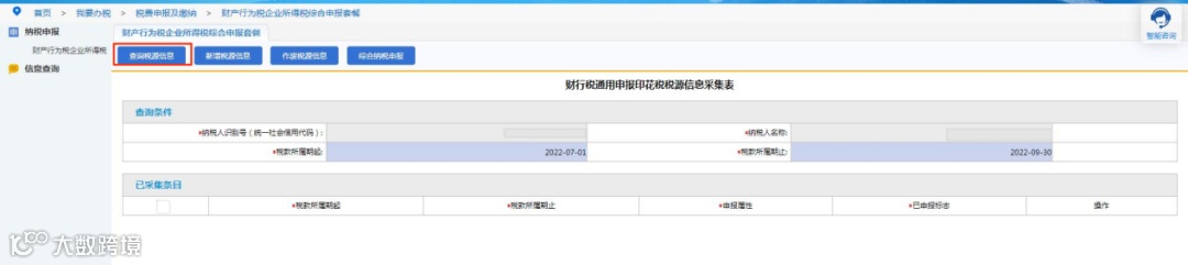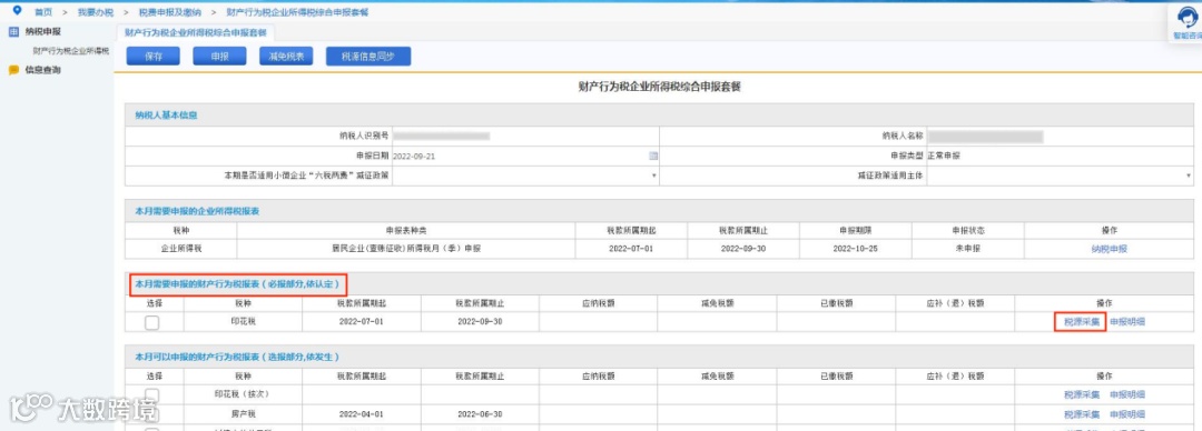 进入“财产行为税企业所得税综合申报套餐”后,在“本月需要申报的财产行为税报表”模块中,找到印花税税种,点击“税源采集”按钮。